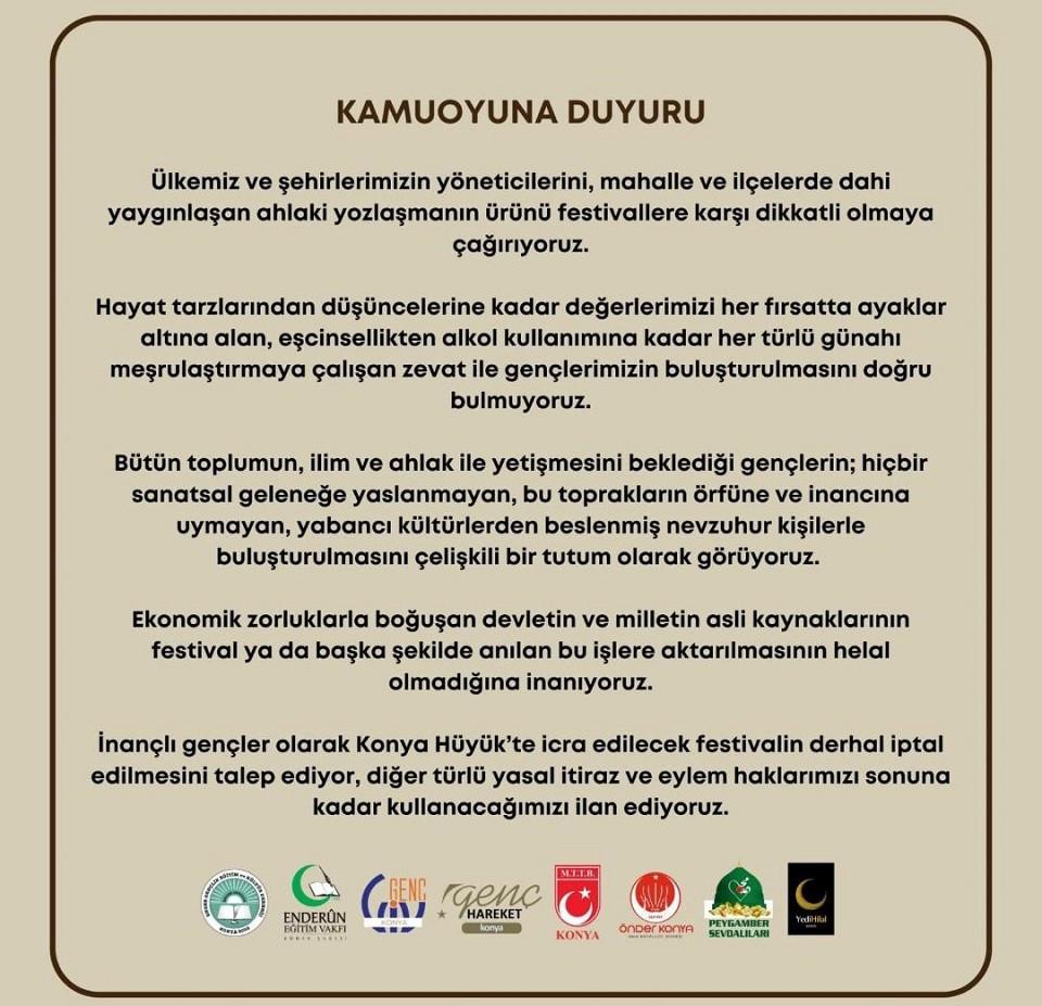 Yasak talep eden bildiri “ekonomik zorluklarla boğuşan devletin ve milletin asli kaynaklarının festival ya da başka şekilde anılan bu işlere aktarılmasının helal olmadığına inanıyoruz. İnançlı gençler olarak Konya Hüyük’te icra edilecek festivalin derhâl iptal edilmesini talep ediyor, diğer türlü yasal itiraz ve eylem haklarımızı sonuna kadar kullanacağımızı ilan ediyoruz” sözleriyle sona erdi.