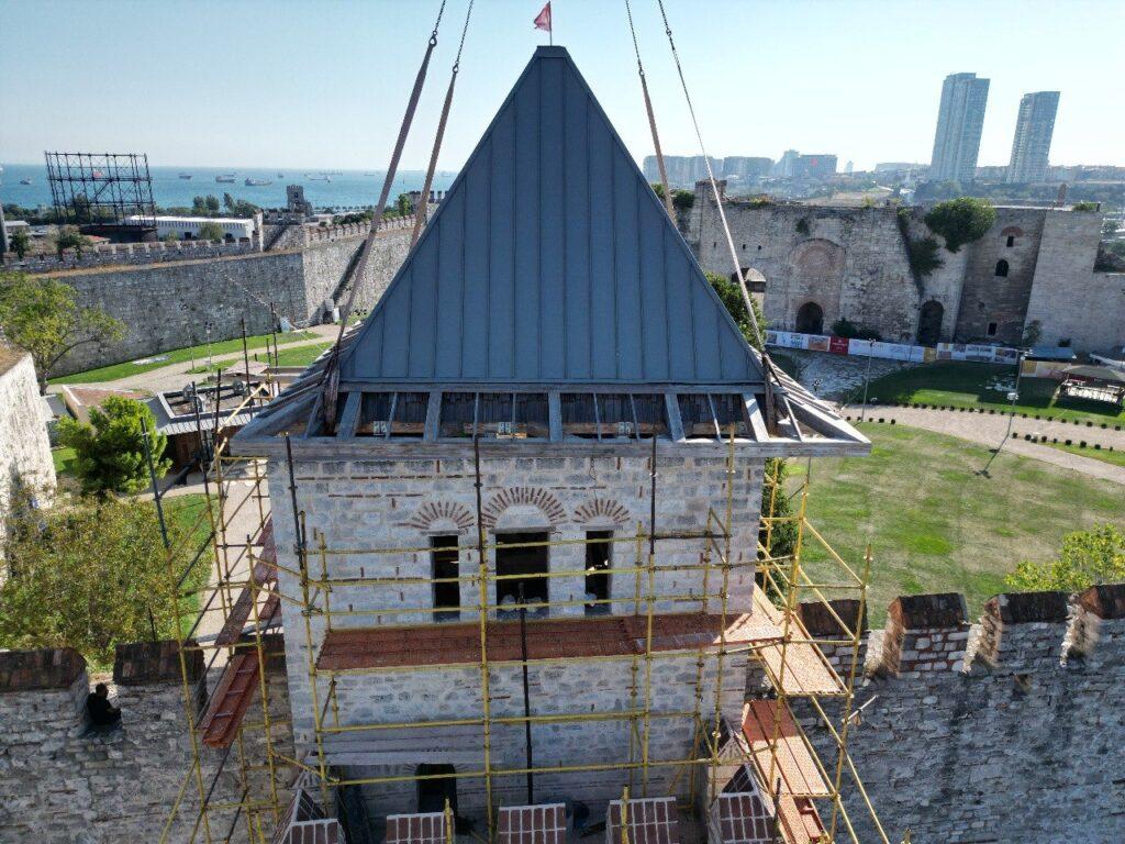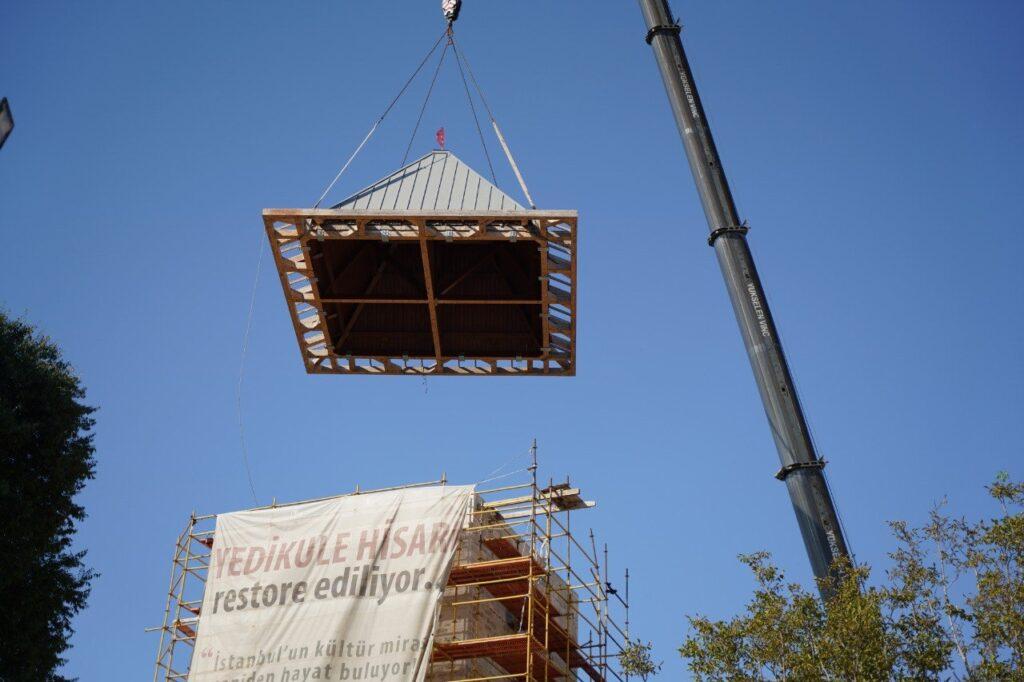 İstanbul’un tarihi sembollerinden biri olan Yedikule Hisarı’nda devam eden restorasyon çalışmalarının bir aşaması daha tamamlandı. Fatih Belediyesi’nin bilim kurulu gözetiminde gerçekleştirdiği restorasyon projesi kapsamında, Hisar’ın adını taşıyan kulelerden biri olan Giriş Kulesi’nin kaybolmuş olan külah çatısı aslına uygun bir şekilde yeniden inşa edilerek yerine takıldı.