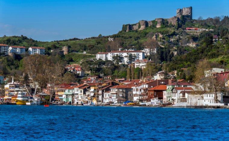 Anadolu Kavağı’nı süsleyen yalılar ve hemen arkasındaki tepede yer alan Yoros Kalesi.