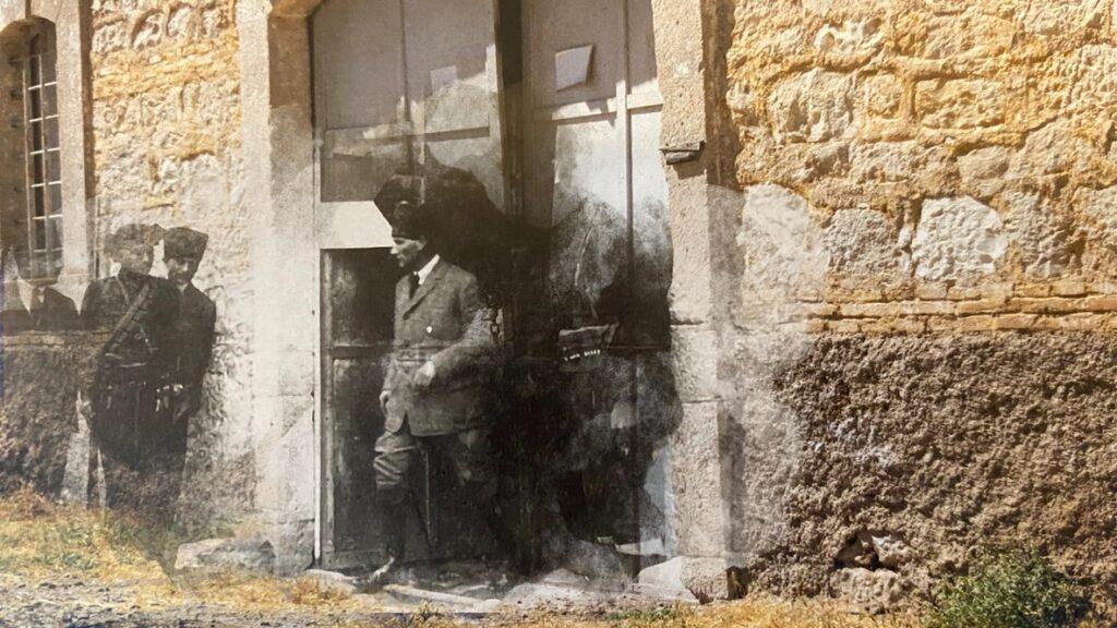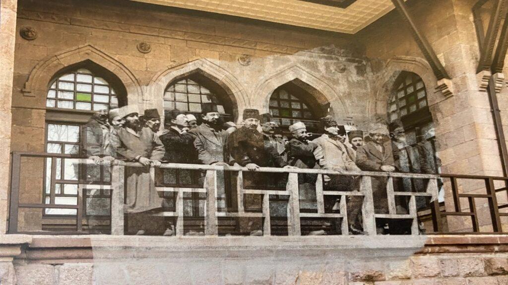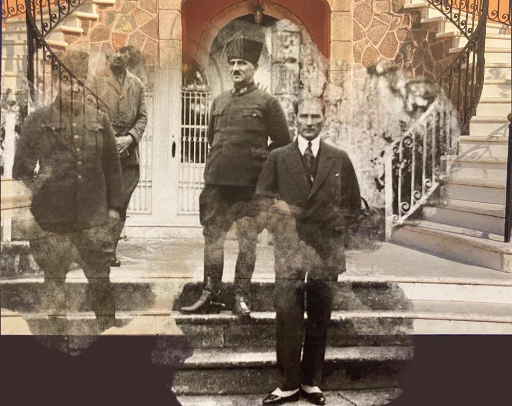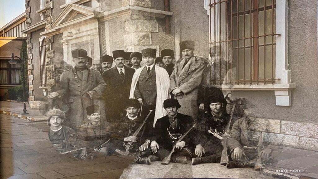 Kurtuluş Savaşı sırasında Ankara’da bulunan birkaç devlet binasından biri olan Direksiyon Binası, Başkomutanlık karargahı ve Mustafa Kemal Paşa’nın konutu olarak uzun süre emrine tahsis edilmişti. 1920-1922 yılları arasında birçok önemli karar burada alındı ve Mustafa Kemal Paşa pek çok görüşmeyi burada yaptı.1 Haziran 1920’ye ait bu fotoğrafta Mustafa Kemal Paşa aralarında Çerkes Ethem’inde bulunduğu Kuvayi Milliye milisleriyle birlikte. Bilindiği üzere Çerkes Ethem düzenli ordunun kurulması sonrasında orduya katılmayacak, isyan edecek ve düşman saflarına geçecekti.