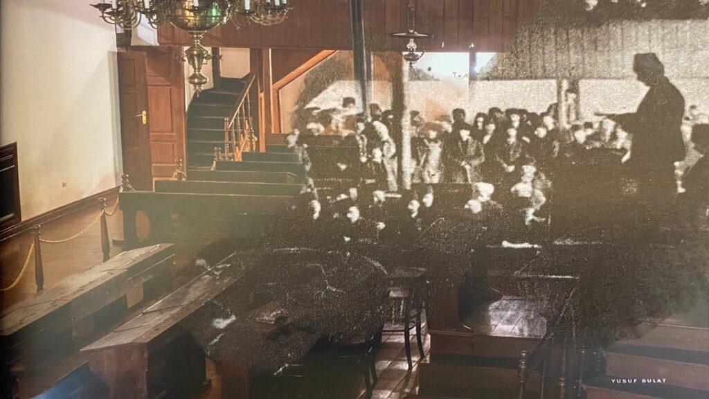 Türkiye Büyük Millet Meclis’in açıldığı gün çekilen bu fotoğrafta Mustafa Kemal Paşa meclise gelen milletvekillerine sesleniyor. O günün en önemli konuşmalarından biri Paşa’nın Ankara’nın şartlarını görünce ümitsizliğe kapılıp memleketlerine dönmeyi dillendiren vekillere yönelik: “Ben kimseyi zorla milli meclise davet etmedim… Ben kutsal davaya inanmış insan sıfatıyla buradan bir yere gitmemeye karar verdim. Hatta hepiniz gidebilirsiniz. Asker Mustafa Kemal mavzerini eline alır, fişekleri göğsüne dizer, bir eline bayrağını alır, bu şekilde Elmadağ’a çıkar, orada tek kurşunu kalıncaya kadar vatanı müdafaa eder. Kurşunlarım bitince, bu aciz vücudumu bayrağıma sarar, düşman kurşunlarıyla yaralanır, temiz kanımı bayrağıma içire içire tek başıma can veririm. Ben buna and içtim.” Bu konuşma sonrası oluşan ümitsizlik sönümlenir. Kurtuluş Savaşı sırasında birçok tarihi konuşmaya, kararlara sahne olan bu meclis bugün Kurtuluş Savaşı Müzesi olarak hizmet veriyor.