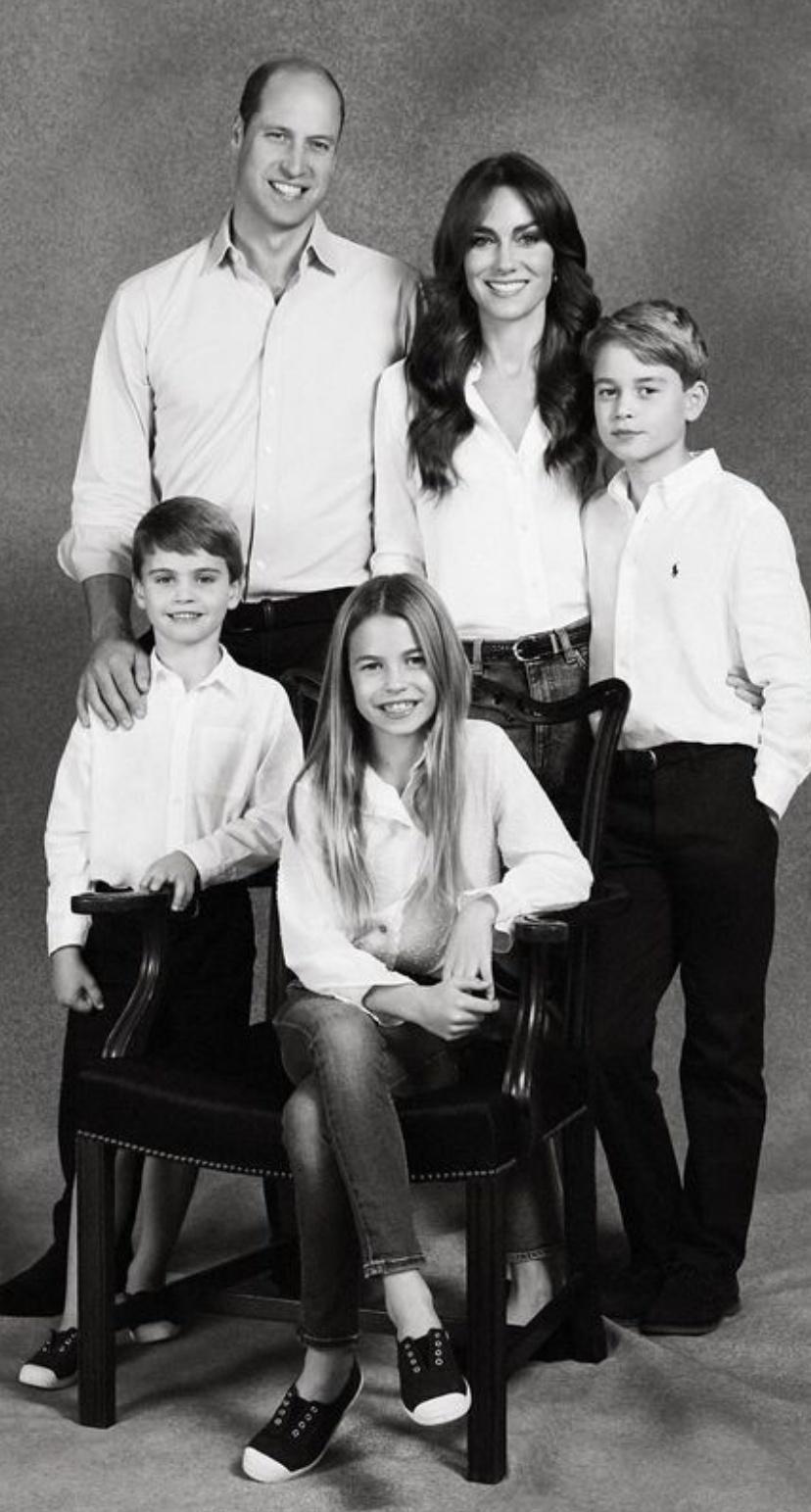 Aile bireyleri fotoğraf çekimi için beyaz gömlek ve kot pantolondan oluşan spor kıyafetleri tercih etti. Sekiz yaşındaki Prenses Charlotte’un siyah bir koltukta oturduğu kompozisyonda diğerleri ayakta durdu.