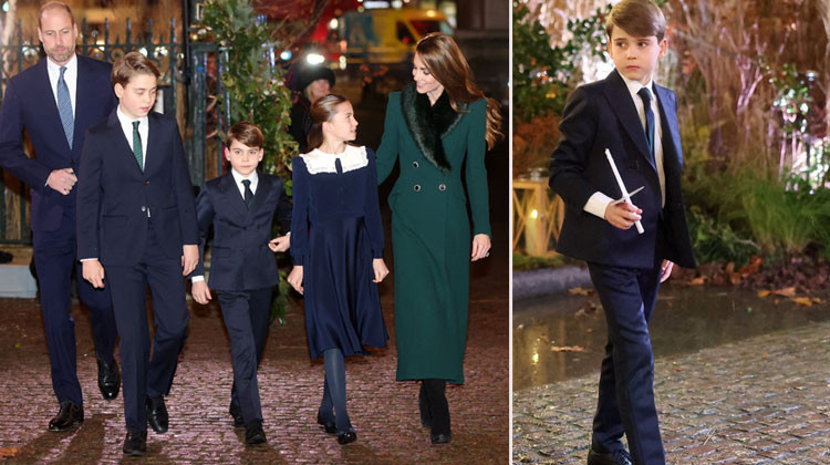 Ailenin erkek çocukları 12 yaşındaki George ile 7 yaşındaki Louis ise tıpkı babaları gibi takım elbiseliydi…Taktıkları kravatlarda da annelerinin üzerindeki mantoya gönderme yapan renkleri uyumlu ekose desenler ardı.
