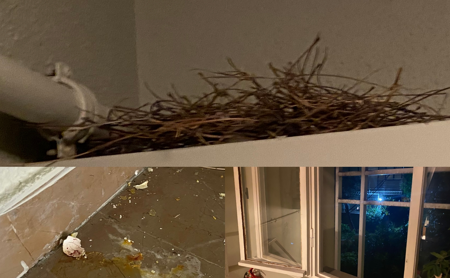 Kumrunun bozulan yuvası (üstte) kırılan bir kumru yumurtası (solda), anne – baba kumrunun doğayla yuva arasındaki bağlantısı olan cam (sağda)