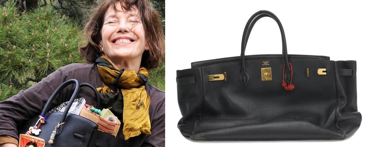 Jane Birkin ve 21 yaşında ölen yeğeni adına kurulan hayır derneği için ebay’de sattığı Birkin çanta (sağda)