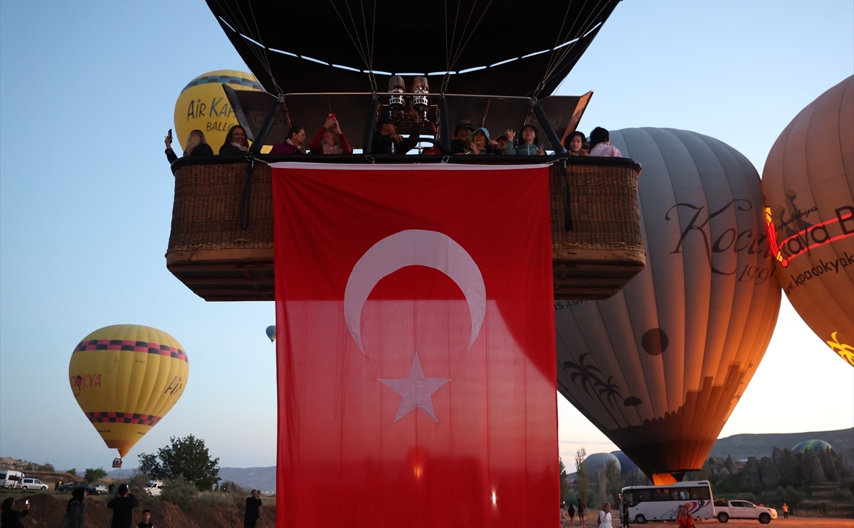 Turistlerin, peribacaları ve doğal kaya oluşumlarıyla kaplı vadileri gökyüzünden izlemelerine olanak sunan sıcak hava balonları gün doğarken uçuş için hazırlandı, sepetlere Türk bayrakları asıldı.