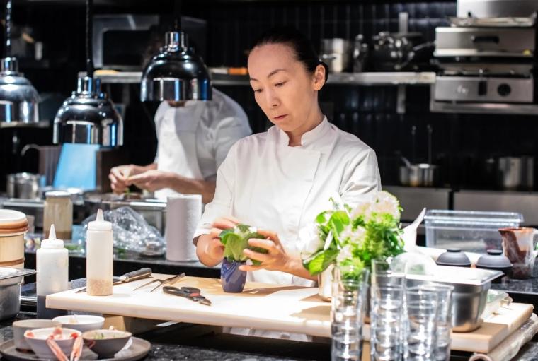 Sankai By Nagaya geçtiğimiz Mart ayında açıldıktan sonra sekiz ay içinde Michelin yıldızına layık görüldü. Bebek Otel’im üçüncü katında, Sankai’nin 24 kişilik, ışıltılı deniz manzarasına sahip sakin yemek salonuna girmemiz için bize bir oda anahtar kartı verildi. Açık mutfakta Hiroko Shibata doğaüstü bıçak becerilerini sergiliyordu.