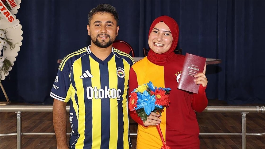 Fanatik Fenerbahçe taraftarı Öksüz ile Galatasaraylı Eser, Sandıklı Belediye Düğün Salonu’nda düzenlenen törende, tuttukları takımların formalarını giyerek nikah masasına oturdu.