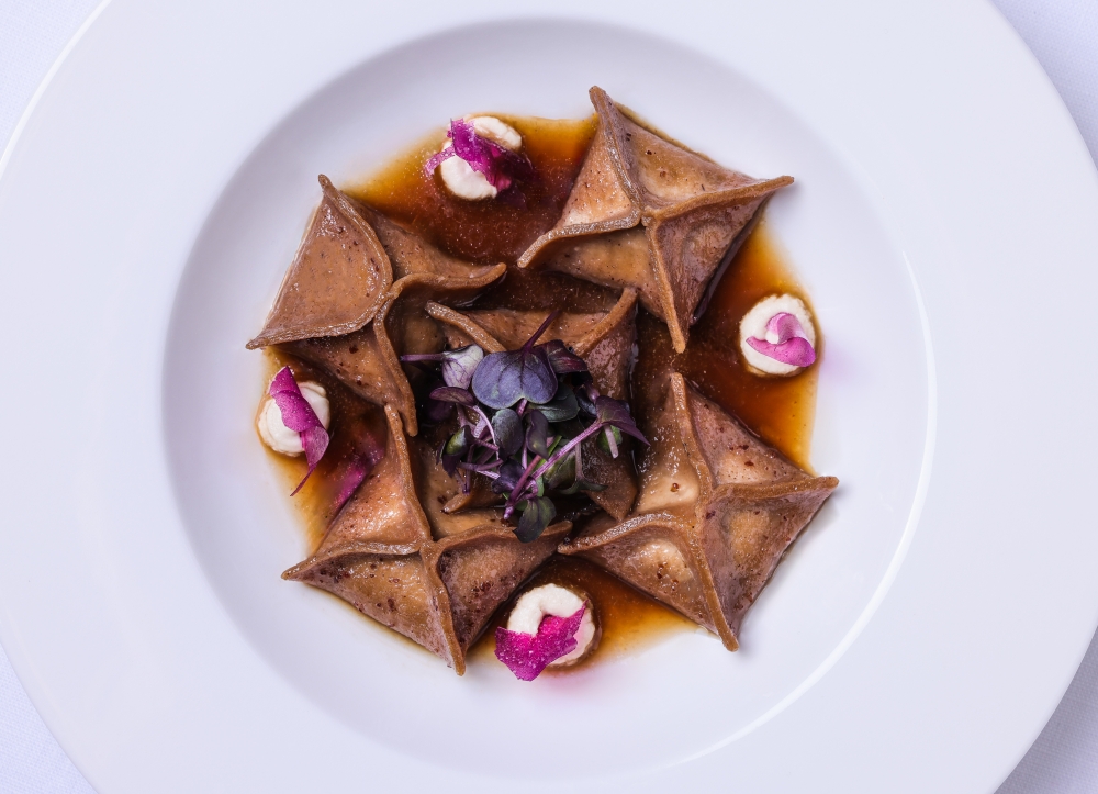 Tütsülenmiş krema, kahveli soğan jus, mor lahana kristali ile hazırlanmış makarna