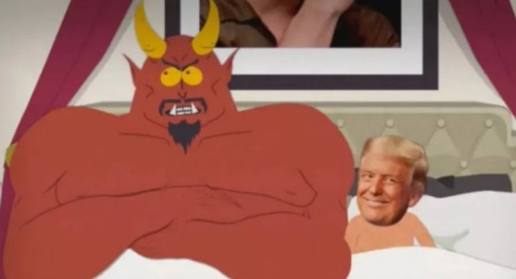 İki buçuk yıllık aranın ardından 27’nci sezonunun ilk bölümü (328’inci bölümü) yayınlanan South Park’ta Trump’ın şeytanla yatağa giriyor, penis boyundan yakınıyor ve Beyaz Saray duvarına çıplak portrelerini asıyordu.
