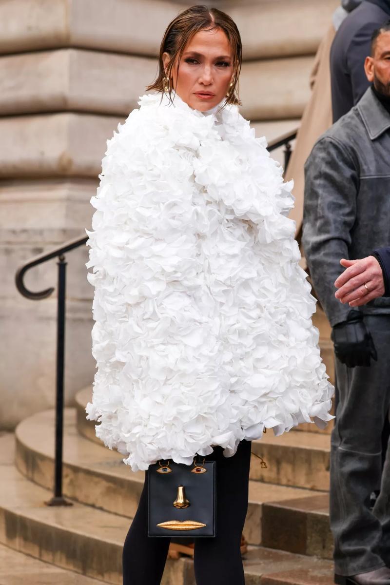 Schiparelli şovunu izlemeye gelen konukların sartaryol tercihleri de dikkate değerdi. Yeni albümü şerefine iç giyim markası Intimissimi ile işbirliği yapan Jennifer Lopez yedi bin gerçek beyaz gül yaprağıyla hazırlanmış bir hırka giydi. Elinde Schiparelli’nin kreatif direktörü Daniel Roseberry’nin tasarladığı bir el çantası vardı.