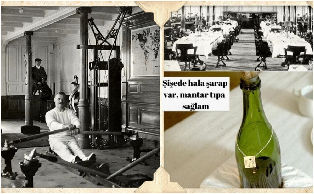 Titanik’te bir spor salonu vardı (solda) gemi mutfağa yakın yerden bölündüğü için denizin dibinde çok sayıda şarap, şampanya şişesi bulundu