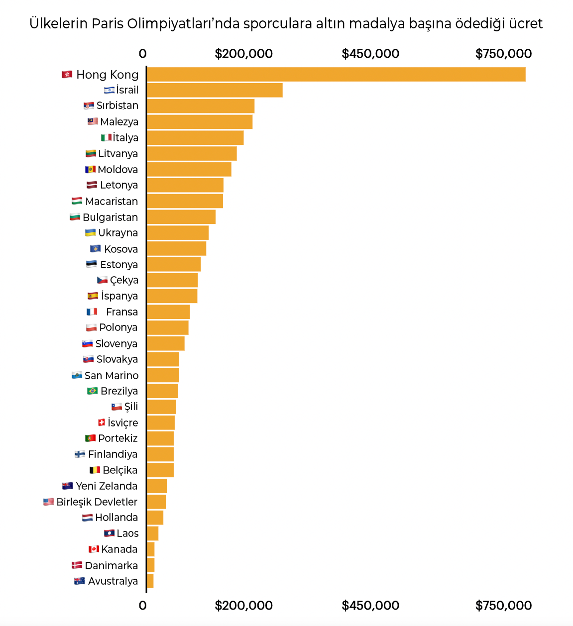 Çin’den bağımsız olarak yarışacak Hong Kong altın madalya kazanan sporcusuna 768 bin dolarlık ödülle açık ara başı çekiyor. Hatta gümüş madalya kazanana vereceği ödül bile kalan 32 ülkenin altın madalyaya vereceği parayı geçiyor: 380 bin dolar. Listenin ikinci sırasındaki İsrail 275 bin dolar, üçüncü sıradaki Sırbistan 218 bin dolar veriyor. Bu üç ülkenin de 2021’de yapılan Tokyo Olimpiyatları’nda altın madalya kazanmış sporcuları var.
