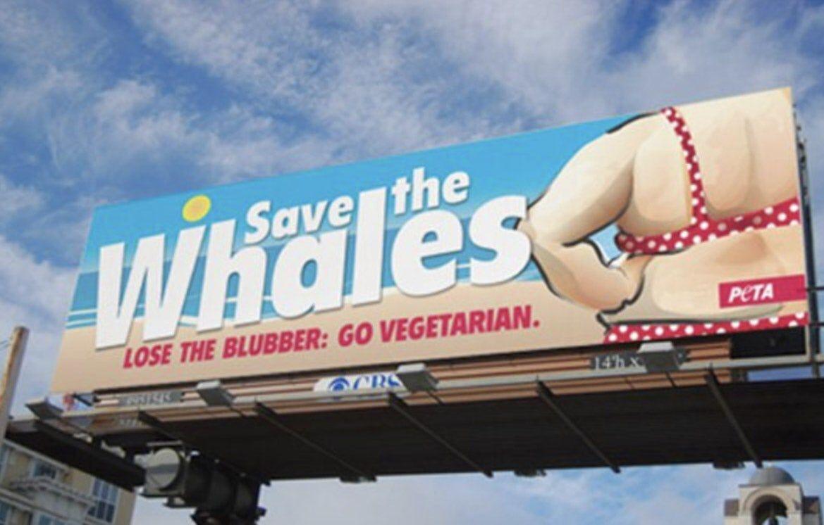 2009’da ABD’nin Florida eyaletinde kullanılan bir açık hava panosunda “Balinaları kurtarın” başlığının hemen altında “Yağlarınızdan kurtulun. Vejetaryen olun” yazıyor. Mesaja sırt ve bel bölgesi görünen bikinili şişman bir kadın çizimi eşlik ediyor.