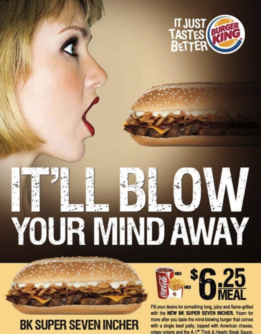 Burger King’in 7 inç (17,7 cm) uzunluğundaki süper burger reklamında birden fazla seksist gönderme var.