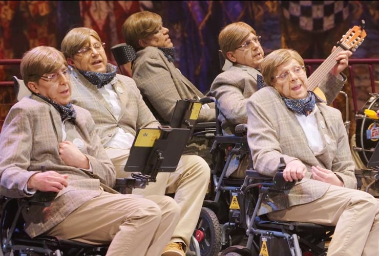 İspanyol karnaval grubu bilim adamı Stephen Hawking gibi giyinip ALS farkındalığı için tur düzenledi.