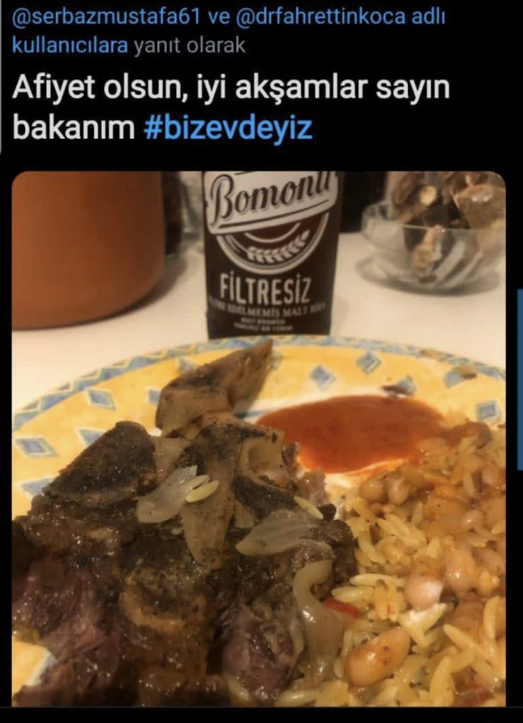 Sağlık Bakanı Fahrettin Koca dün akşam Türkiye’de Twitter’ın başlıca gündem maddesiydi. Koca, “bizevdeyiz” etiketiyle mesaj atıp “Evde olduğunuza dair resim paylaşın” deyince Twitter’dan fotoğraflı mesaj yağdı. Binlerce paylaşım arasında evde içki içtiğini sergileyenlerin fotoğrafları özellikle dikkat çekti.
