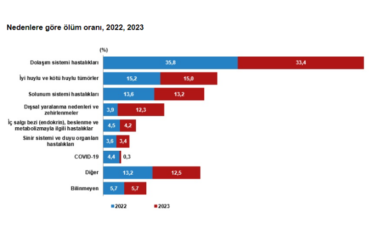 Ölümler nedenlerine göre incelendiğinde, 2023 yılında yüzde 33,4 ile dolaşım sistemi hastalıkları ilk sırada yer aldı. Bu ölüm nedenini yüzde 15,0 ile iyi huylu ve kötü huylu tümörler, yüzde 13,2 ile solunum sistemi hastalıkları izledi.