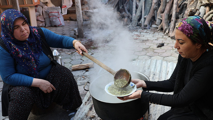 Adana’nın Kozan ilçesinde kadınlar, iftar sofraları için bahçelerden topladıkları yılan pancarı otunu imece usulü hazırlıyor. İncecik doğranan ot yoğurt, nohut, yarma ve limonla karıştırılıp üstü unla kapatılarak 24 saat bekletiliyor. Zehri alınan ot ardından odun ateşinde kara kazanda yaklaşık 4 saat pişirilerek sofralarda yerini alıyor.