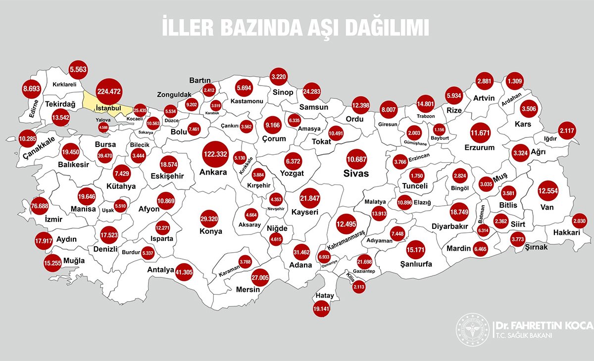 Sağlık Bakanı Fahrettin Koca illere göre aşı olanların sayısını paylaştı. Türkiye’de 1 milyon 200 binden fazla kişinin aşılandığını söyleyen Koca, en fazla aşının İstanbul’da yapıldığını anlattı. Bu liste yarından itibaren canlı olarak da Sağlık Bakanlığı web sitesinden takip edilebilecek.