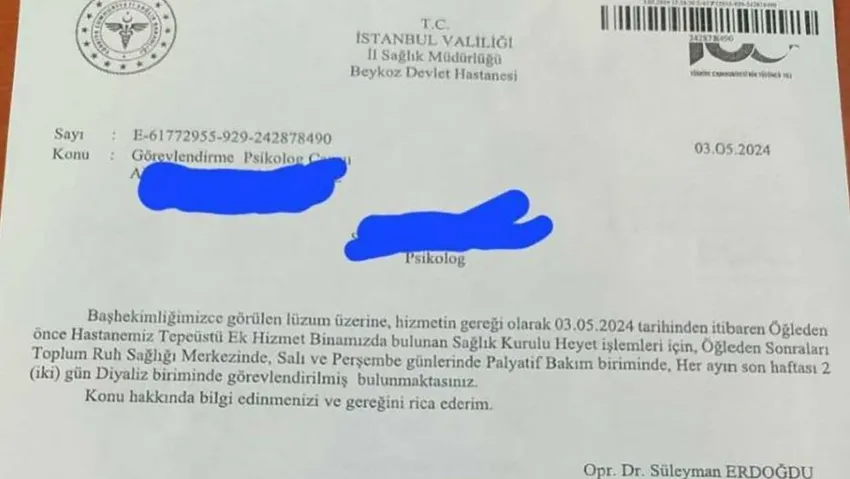 İstanbul’da Beykoz Devlet Hastanesi başhekimi tarafından gönderilen yazıyla hastanede çalışan psikolog dört farklı yerde görevlendirildi.