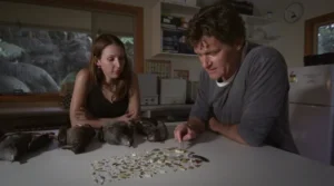 A Plastic Ocean belgeselinin senaristi ve yapımcısı gazeteci Craig Leeson (sağda) ve araştırmacı Dr. Jeniffer Lavers bir deniz kuşunun midesinden çıkan 234 parça plastiği sayıyor.