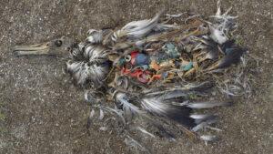 Pasifik Okyanusu’ndaki Midway Adası’nda ölü bir genç albatrosun vücudundan çıkan plastikler.