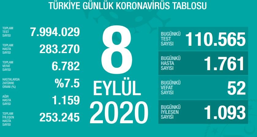 Türkiye’de son 24 saatte 1761 kişiye daha korona tanısı konuldu, 52 kişi vefat etti, ağır hasta sayısı 1159 oldu. Sağlık Bakanı Fahrettin Koca, ağır hasta sayısında artışın sürdüğünü söyledi.