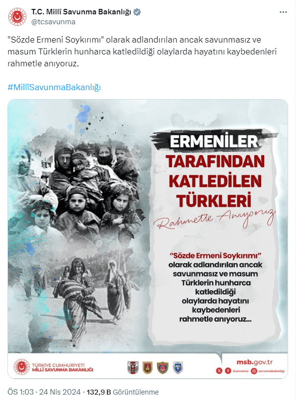 “Sözde Ermeni Soykırımı’ olarak adlandırılan ancak savunmasız ve masum Türklerin hunharca katledildiği olaylarda hayatını kaybedenleri rahmetle anıyoruz.”