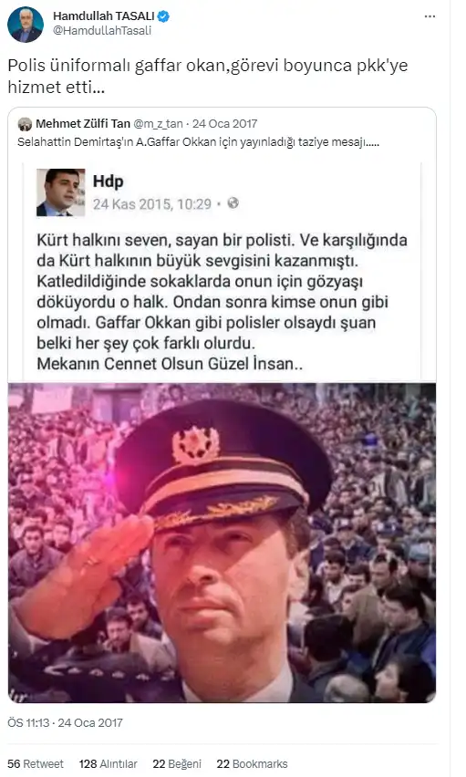 Öte yandan HüdaPar Genel Başkan Yardımcısı Hamdullah Tasalı da Gaffar Okkan’ı hedef aldı. Hamdullah Tasalı, ilgili paylaşımında, “Polis üniformalı Gaffar Okkan, görevi boyunca PKK’ye hizmet etti” dedi. Hamdullah Tasalı, paylaştığı skandal ifadelerin ardından hesabını kapatmak zorunda kaldı.