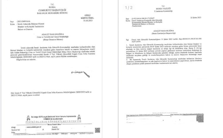 Adalet Bakanı Bekir Bozdağ, önceki gün “Orada bir sürü teknik anlamda sorun oluyor. Oraya teknik ekip gidiyor. Bunun Öcalan ile hiç alakası yok” dedi. Dün ise Sabah Gazetesi, bakanlık tarafından teknik ekibin gönderilmesine ilişkin belgeleri yayınladı. Haberde yer alan belgelerde İmralı Jandarma Ada Güvenlik Komutanlığı tarafından kullanılan hizmet binaları ve kolaylık tesislerinin çatılarında 5-7 Şubat’ta meydana gelen fırtına nedeniyle hasar oluştuğu ve bina içlerine su aktığı kaydedildi. Oluşan hasar nedeniyle, Bursa İl Jandarma Komutanlığı’nın, Ceza ve Tevkifevleri Genel Müdürlüğüne Bursa Cumhuriyet Başsavcılığının üst yazısı ile İmralı Jandarma Ada Güvenlik Komutanlığı tarafından kullanılan hizmet binaları ve kolaylık tesislerinde meydana gelen hasarların ve tespit edilecek ihtiyaçların bakım ve onarımlarının yaptırılması için teknik ekip görevlendirilmesinin talep edildiği aktarıldı.