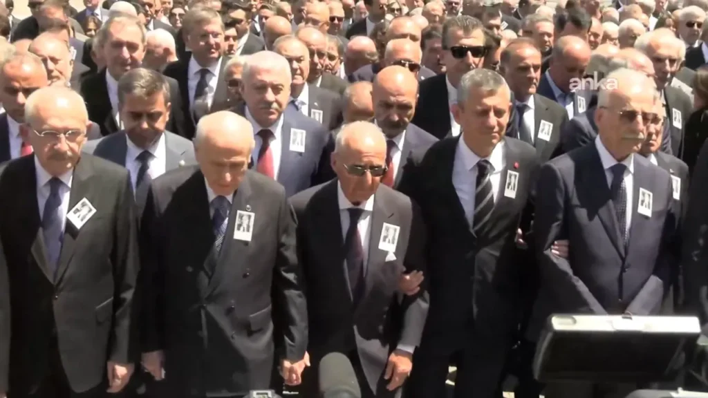 Ama eski Dışişleri Bakanı, eski Meclis Başkanı ve eski CHP Genel Başkanı Hikmet Çetin’in hemen sağında, Devlet Bahçeli vardı ve Bahçeli ile Çetin el ele tutuşuyorlardı. Bahçeli’nin sağında ise bir başka eski CHP Genel Başkanı, Kemal Kılıçdaroğlu vardı.