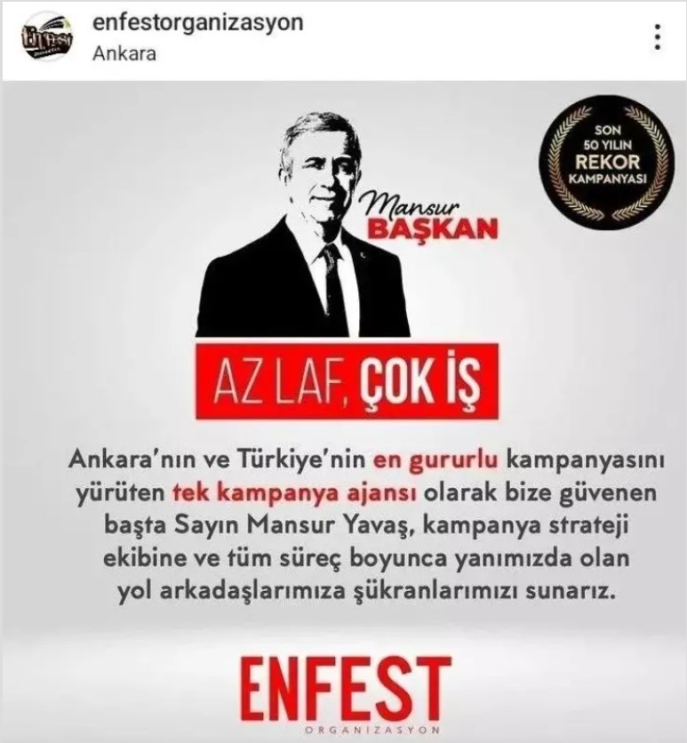Ancak iddialar bununla sınırlı değildi. Bir de organizasyon firması gündeme geldi. Sabah Gazetesi seçim döneminde Mansur Yavaş’ın seçim kampanyasını da yürüten Selahattin Çetinkaya’nın Enfest ve Festiva şirketlerinin Ankara Büyükşehir Belediyesi’ne son 4 yılda doğrudan hizmet alımıyla 98 konser organizasyonu yaptığının ortaya çıktığını yazdı. Enfest Organizasyon şirketinin 28 Aralık 2023 tarihinde sermaye artırımına gittiği de yazıldı.