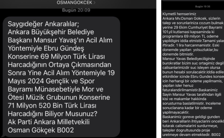 Bu gerginlik bununla da kalmadı aslında AK Parti Ankara Milletvekili Osman Gökçek, Ankaralılara kısa mesaj gönderdi, “Ankara Büyükşehir Belediye Başkanı Mansur Yavaş, acil alım yöntemiyle Ebru Gündeş konserine 69 milyon Türk Lirası harcadı” dedi.