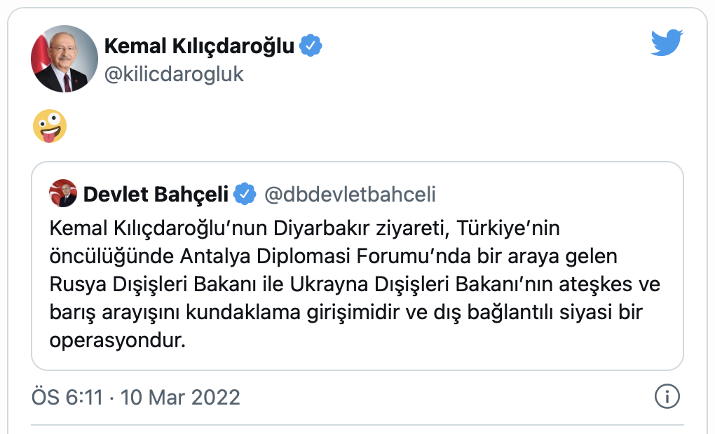 CHP lideri Kemal Kılıçdaroğlu’nun Diyarbakır gezisine MHP lideri Devlet Bahçeli’den tepki geldi. Twitter üzerinden geziyi eleştiren Bahçeli, bu gezinin “dış bağlantılı bir siyasi operasyon” olduğunu öne sürdü. Kemal Kılıçdaroğlu bu mesaja cevaben Twitter’da Bahçeli’ye dilini çıkarıp gülen kafa emojisi gönderdi.