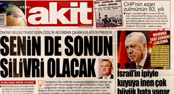 Türk medyasının İslamcı troll gazetesi Yeni Akit, kendini konuşturmak için bu kez CHP lideri Özgür Özel’i hedef aldı, ona “Senin de sonun Silivri olacak” diye seslendi.