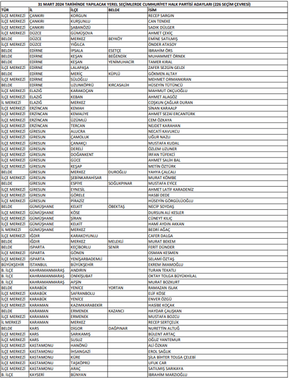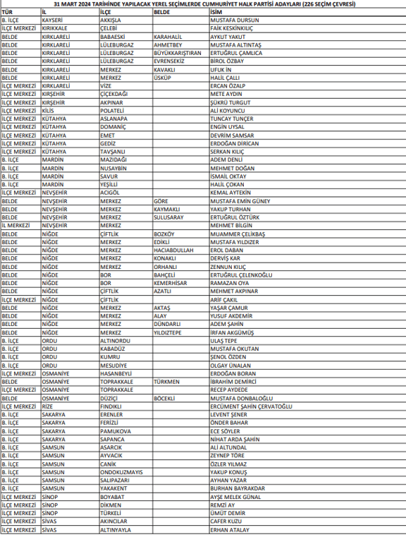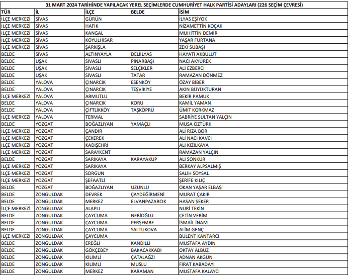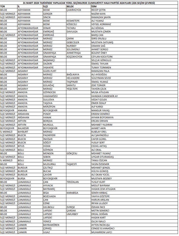 31 Mart 2024 yerel seçimlerinde CHP’nin belirlediği adaylardan önce çıkanlar şu şekilde;