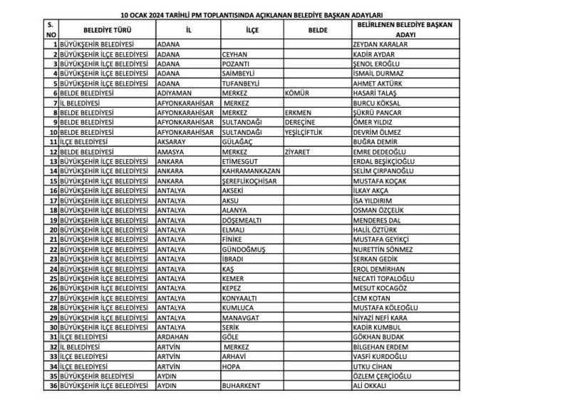PM’de belirlenen belediye başkan adaylarını gecenin ilerleyen saatlerinde düzenlediği basın toplantısıyla parti sözcüsü Deniz Yücel açıkladı.