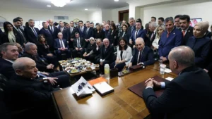 Erdoğan, Meclis’te yeni yasama yılı açılışının ardından MHP Genel Başkanı Devlet Bahçeli, DEM Parti Eş Genel Başkanı Tuncer Bakırhan ve İYİ Parti lideri Müsavat Dervişoğlu ile Başkanlık Divanı’nda görüştü. Erdoğan görüşme sonrası gazetecilere yaptığı açıklamada, “Çok samimi bir şekilde liderlerle görüşmemizi yaptık” dedi