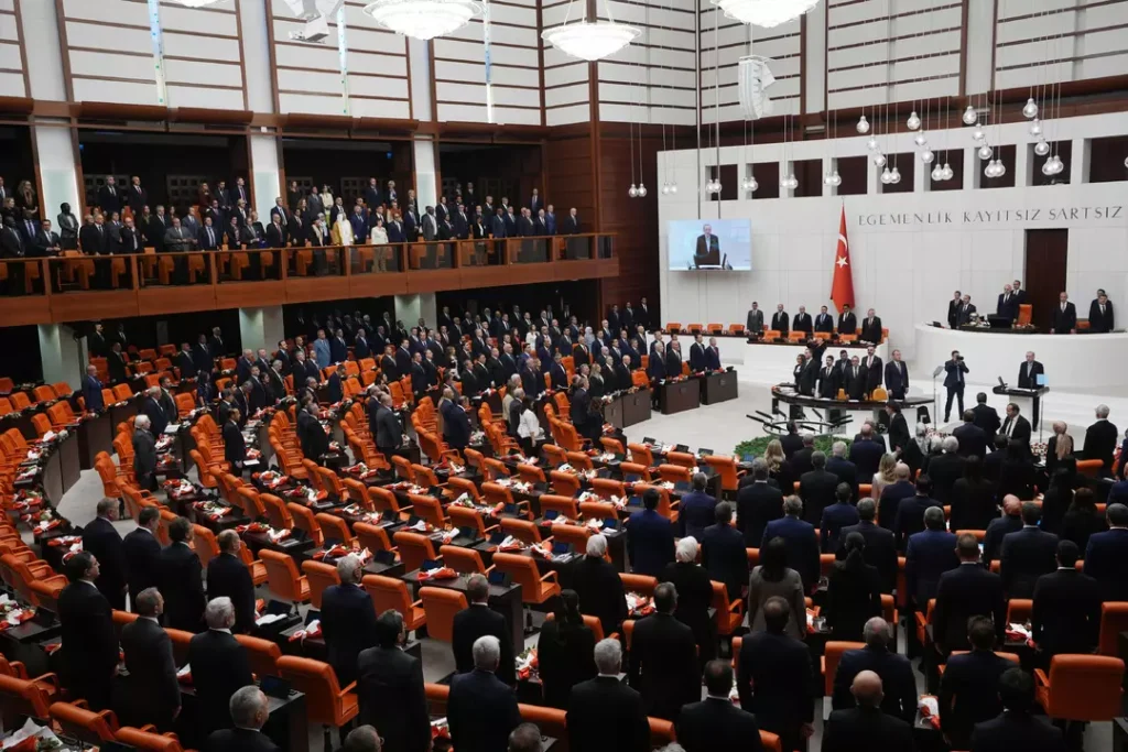 TBMM’de gerçekleşen özel oturumda CHP, TİP ve EMEP sıraları boş kaldı. İYİ Parti ve DEM Parti grupları Cumhurbaşkanı Genel Kurul Salonuna girdiğinde ayağa kalktı ancak alkışlamadı. Diğer partiler ise Erdoğan’ı ayakta alkışlayarak karşıladı.
