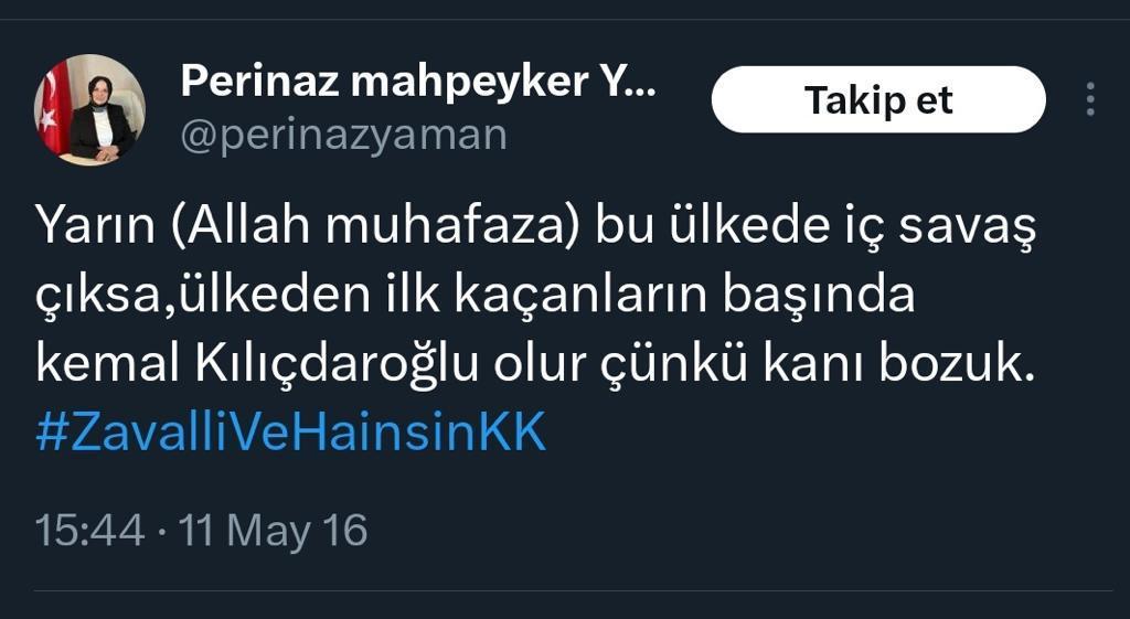 Perinaz Mahpeyker Yaman’ın Kılıçdaroğlu’na ‘kanı bozuk’ dediği tweet.