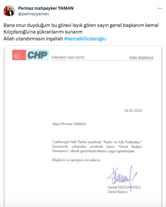 CHP’de seçimden sonra sular bir türlü durulmuyor. Her gün başka bir gerçek, başka bir iddia ortaya çıkıyor. Son gelişme ise daha önce attığı tweetlerde CHP Genel Başkanı Kemal Kılıçdaroğlu’na “kanı bozuk” diyen, tarikatları öven Perinaz Mahpeyker Yaman’ın 26 Mayıs’ta danışman olarak atanmasının ortaya çıkması oldu. Bunu Perinaz Mahpeyker Yaman kendi sosyal medya hesabından duyurdu.