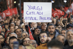 Belediye Başkanı Bozbey’in gözaltına alınmasına tepki gösteren büyük bir kalabalık “Hak, hukuk, adalet”, “Direne direne kazanacağız” ve “Bursa seninle” sloganları attı.