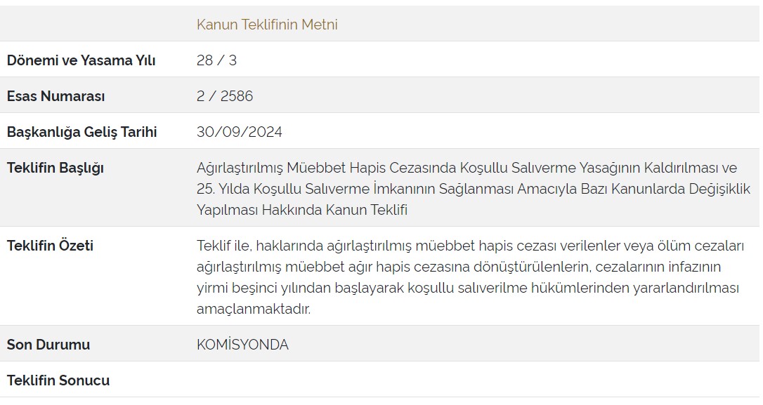 Bu açıklamayla birlikte gündeme gelen ‘umut hakkının’ aslında DEM Parti’nin de Meclis’e sunduğu kanun teklifinde yer aldığı ortaya çıktı. DEM Parti Grup Başkanvekili Erzurum Milletvekili Meral Danış Beştaş 30 Eylül’de “Ağırlaştırılmış müebbet hapis cezasının infazında 25. yılda koşullu salıverilme şartlarının değerlendirilmesi için bazı kanunlarda değişiklik yapılması” hakkında kanun teklifi vermişti.