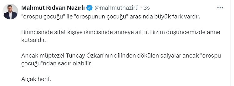 Diğer yandan Özkan’a AK Partili vekiller ve yetkililer tepki yarışına girdi. AK Parti Mardin Milletvekili Mahmut Rıdvan Nazırlı Özkan’a küfür etti. Nazırlı’nın paylaşımı şöyle: