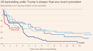 FT’nin ‘veri gazetecisi’ John Burn-Murdoch tarafından derlenen bilgiler ve grafiklere Burn-Murdoch’un bir de yarım yazısı eşlik ediyor. Yazının odağı Amerika’nın yaşadığı hızlı demokratik gerileme.
