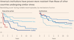 Son olarak gazetede yayımlanan yazıda kurumsal gerilemeye de bakılmış. Endekste kıyaslaması yapılan bütün ülkelerde kurumlar bir ölçüde direniş gösteriyor, Amerikan kurumları şimdilik en güçlü direnişi sergiliyor.