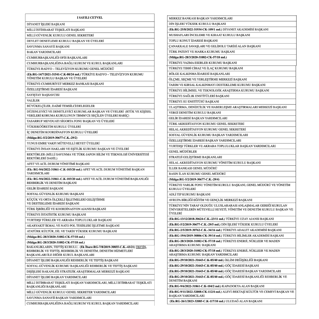 Görev süresi sona eren bürokratlar listesinde Milli İstihbarat Teşkilatı Başkanı, Diyanet İşleri Başkanı, Savunma Sanayii Başkanı, bakan yardımcıları, valiler, rektörler, YÖK üyeleri, SGK Başkanı, TÜİK Başkanı, RTÜK Başkanı, büyükelçiler başta olmak üzere yaklaşık 800 üst düzey yönetici yer alıyor.