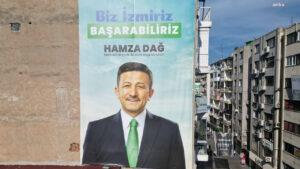 Dağ, görüntülerde içki içenlerle samimi şekilde sohbet ediyor, oy istiyor ve ‘Vermezseniz de canınız sağ olsun’ diyor. Dağ’ın İzmir’de astırdığı seçim afişlerinin bir kısmında AK Parti logosu ve Cumhurbaşkanı Erdoğan’ın fotoğrafı yok. Afişlerde yalnızca Dağ’ın fotoğrafı ve “Biz İzmiriz Başarabiliriz” sloganı yer alıyor. Aslında bu stratejiyi cumhurbaşkanlığı seçimlerinde tüm kesimlerden oy almak isteyen CHP de kullanmıştı. Benzer bir şeyi şimdi Hamza Dağ İzmir’de deniyor.
