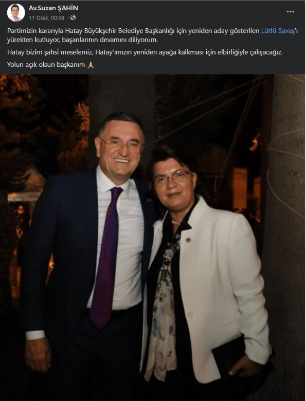 Tüm bunların üzerine CHP’nin geri adım atıp Hatay Büyükşehir Belediyesi için eski milletvekili Suzan Şahin’e teklif götürdüğü iddia edildi. Şahin ise Savaş’ın adaylığını ilk tebrik edenle arasındaydı.